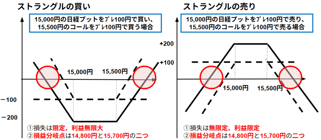 問1.ストラドルの買いとストラングルの買いと呼ばれるポジションは損益分岐点が二つある。