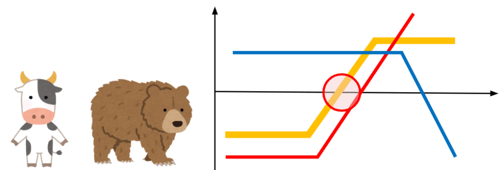 | バーティカル〇〇スプレッド | ①ブル↑ベア↓ ②損失・利益ともに限定 ③損益分岐点は一つ |