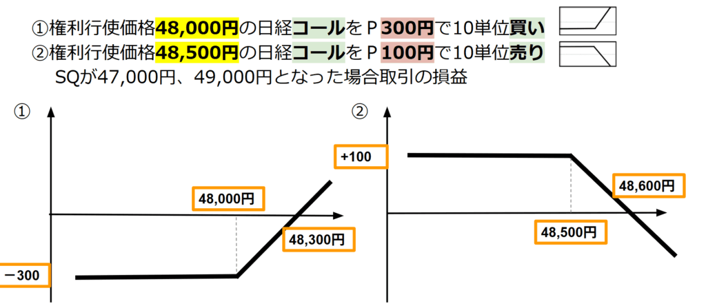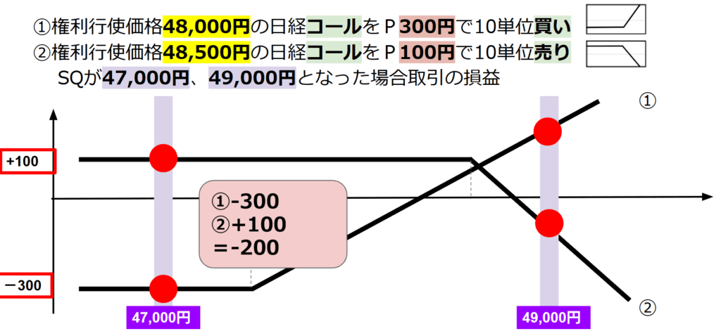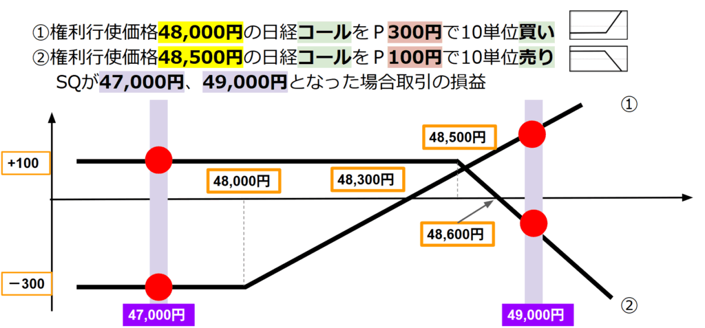 権利行使価格48,000円の日経225コール・オプションをプレミアム300円で10単位買い建てるとともに、権利行使価格48,500円の日経225コール・オプションをプレミアム100円で10単位売り建てた。その後、転売は行わず最終決済期日を迎え、SQが47,000円となった場合及び49,000円となった場合のそれぞれの場合における取引全体での損益を求めよ。