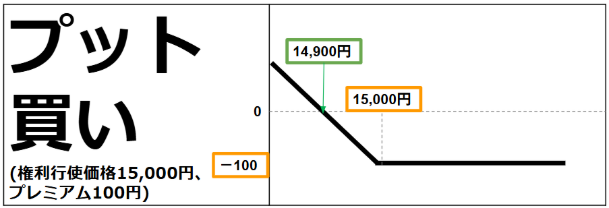 ①利益無限定②損失は100円のみで限定③損益分岐点は14,900円