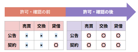 | 契約締結の時期の制限 | 宅建業者は宅地の造成工事、建物の建築工事の必要な許可や確認等を受けた後でなければ自ら売買または交換の契約または売買または交換の媒介・代理をしてはならない。 |